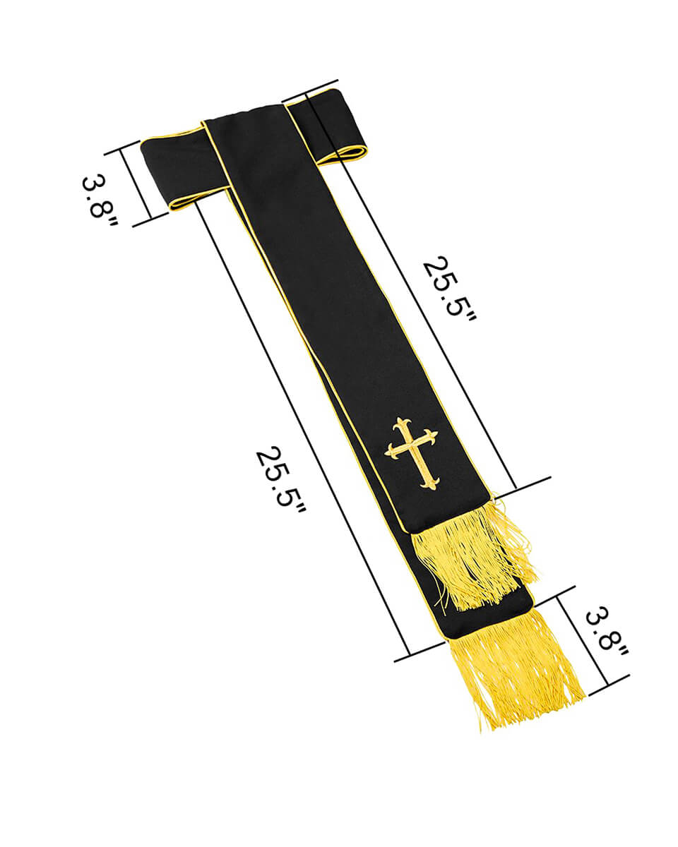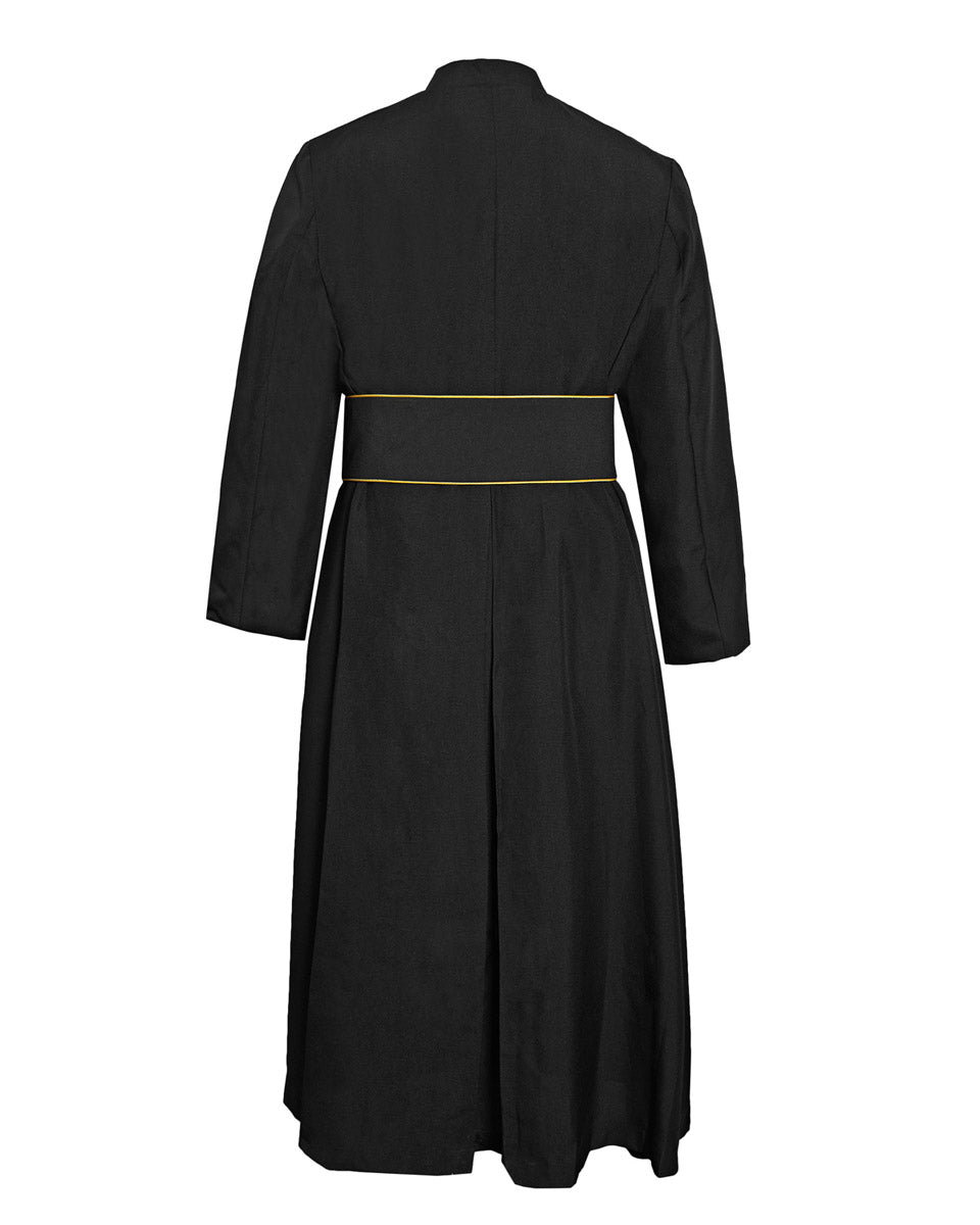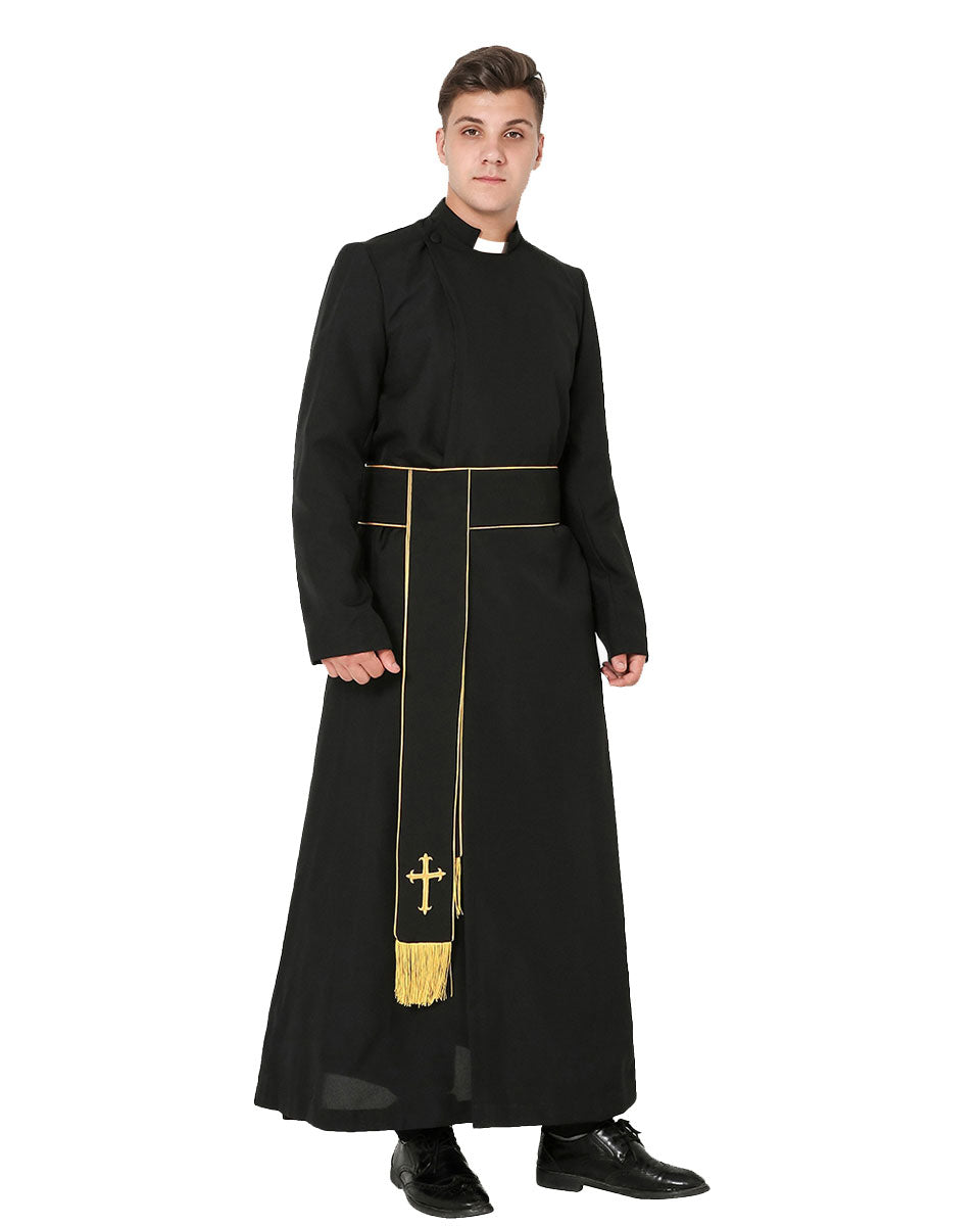 The Anglican Cassock & Band Cincture Package consisted of 100% thick matte polyester which is durable and wrinkle-free. The cassock has a side pocket and two front buttons. It is the band with fringe at the bottom that makes this suit formal and elegant. The Gold Latin Cross which embroidered on the one side of the cincture makes the set solemn. Adopting the design of adjustable velcro closures, the band is easy to belt up. There are 13 sizes for cassock and 4 sizes for cincture, which could meet customers' needs better.