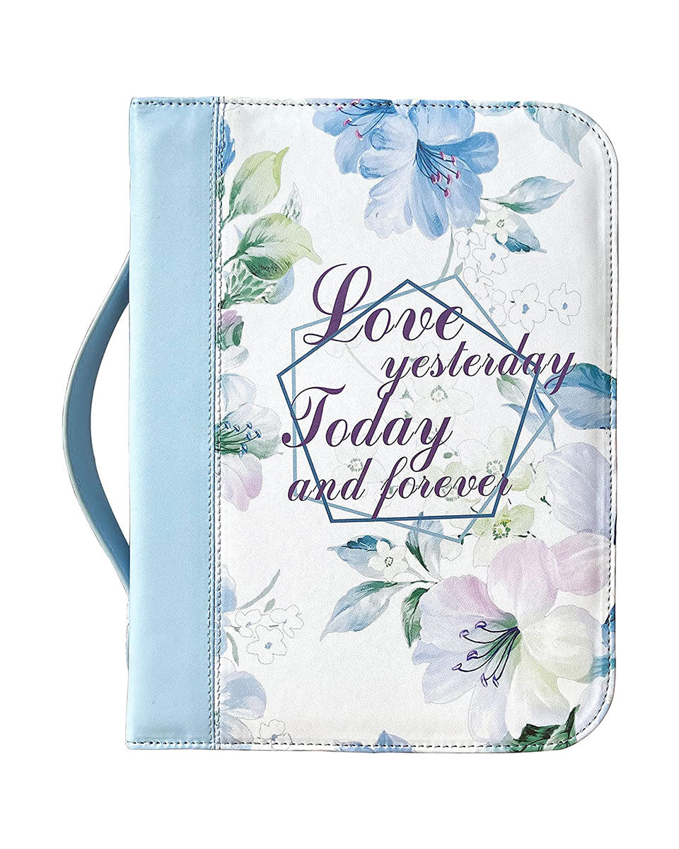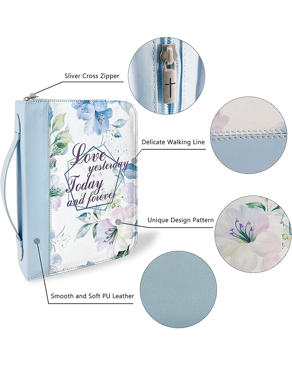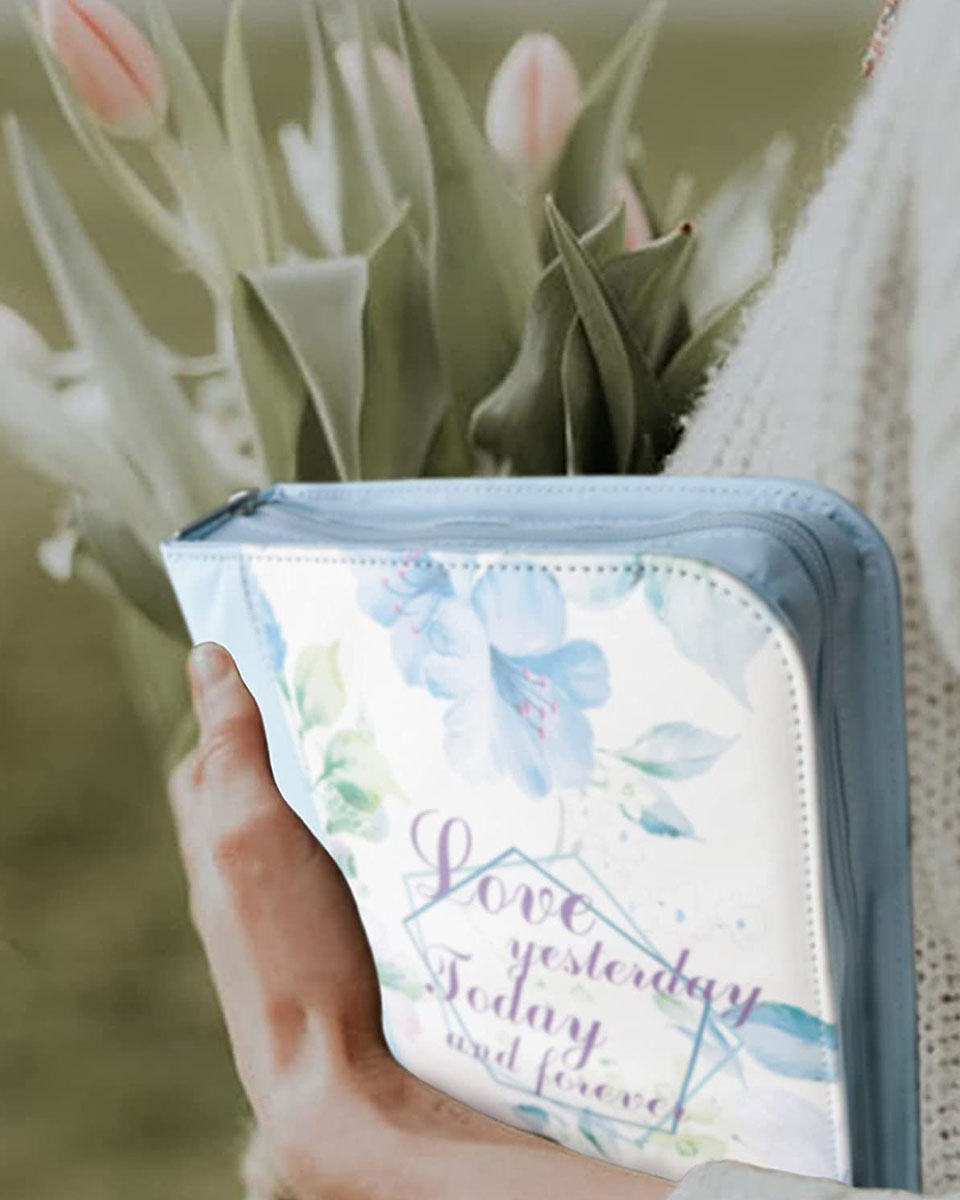 Zippered Bible case keeps your Bible clean and safe from accidents and mishaps. Interior slip pockets hold the Bible cover in place and pen loops provide a handy place for a pen or highlighter. The baby blue floral cover is printed with inspiration words as "love yesterday today and forever". Baby blue color is a soft shade of blue, and just like any other blue hue, the association with sky and ocean makes this shade a symbol of peace and tranquility. It has inner organizing pockets, perfect for storing notebook, passport, tickets and cards, keys, files, and a pen loop to hold your pen. Cover fits books and bibles no larger than 10 x 7.5 x 2 inches. Please measure your bible size before purchase to avoid return. Allow extra room to avoid a too snug fit.