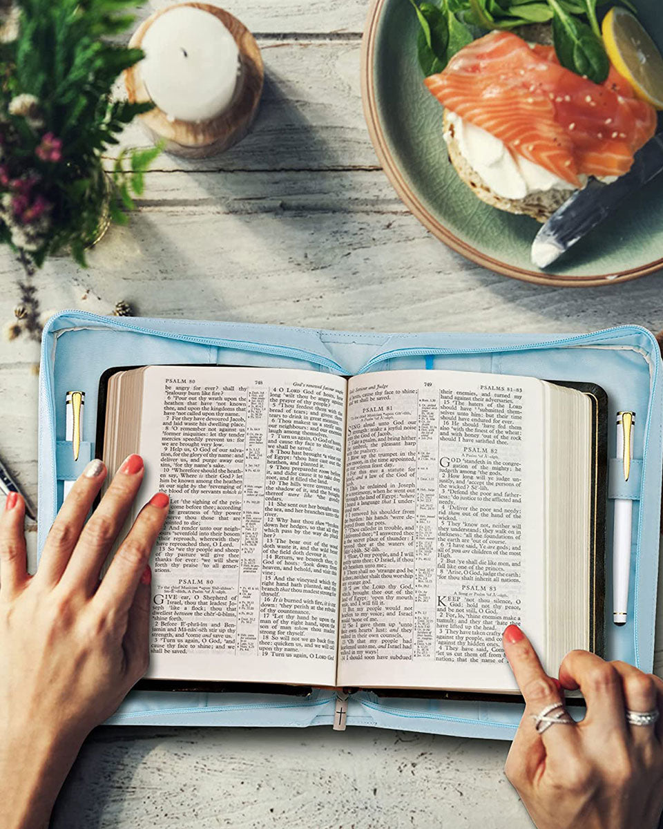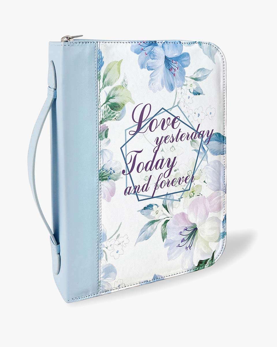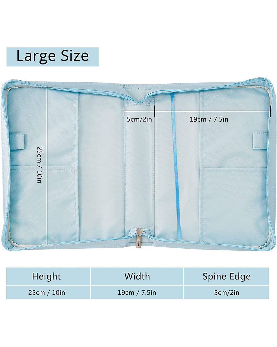 Zippered Bible case keeps your Bible clean and safe from accidents and mishaps. Interior slip pockets hold the Bible cover in place and pen loops provide a handy place for a pen or highlighter. The baby blue floral cover is printed with inspiration words as "love yesterday today and forever". Baby blue color is a soft shade of blue, and just like any other blue hue, the association with sky and ocean makes this shade a symbol of peace and tranquility. It has inner organizing pockets, perfect for storing notebook, passport, tickets and cards, keys, files, and a pen loop to hold your pen. Cover fits books and bibles no larger than 10 x 7.5 x 2 inches. Please measure your bible size before purchase to avoid return. Allow extra room to avoid a too snug fit.