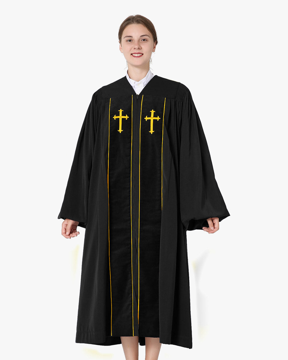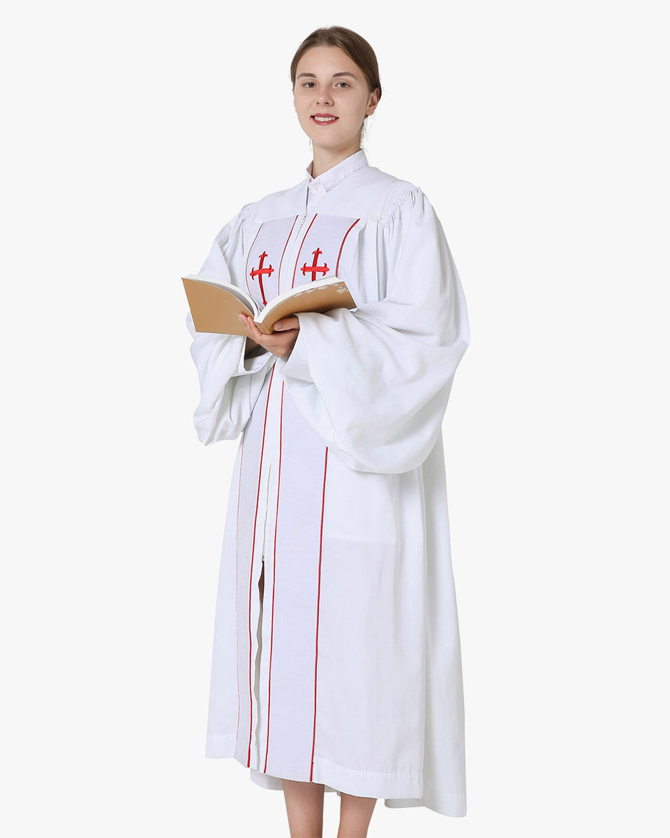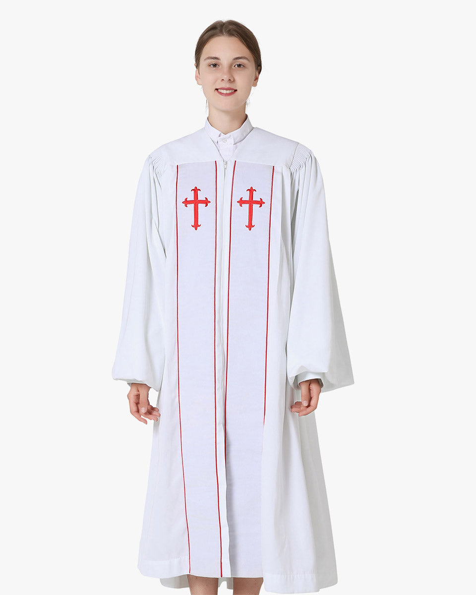 Cleric clergy robe is made of highest quality polyester fabric and finest workmanship. It features in 3 colors, royal blue, white and black. Colorful gown has same color front panel with piping and embroidery cross. It is free-wrinkle, light weight and durable. These kinds of Cleric Clergy Robes provide you with top notch quality and comfort at a very reasonable rate. Expert craftsmanship takes time so purchase yours ahead of time. And you will save more money with more orders.