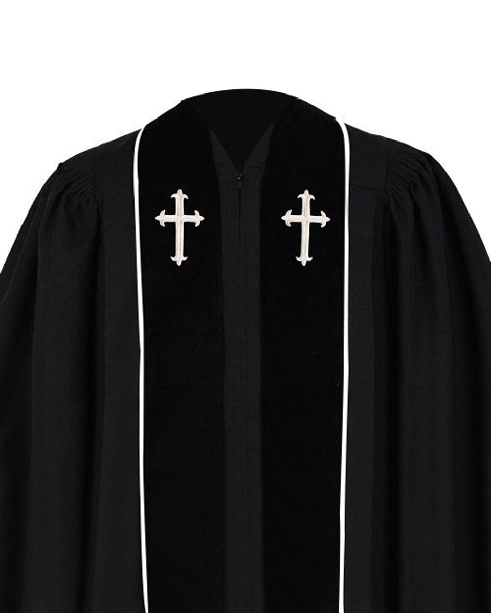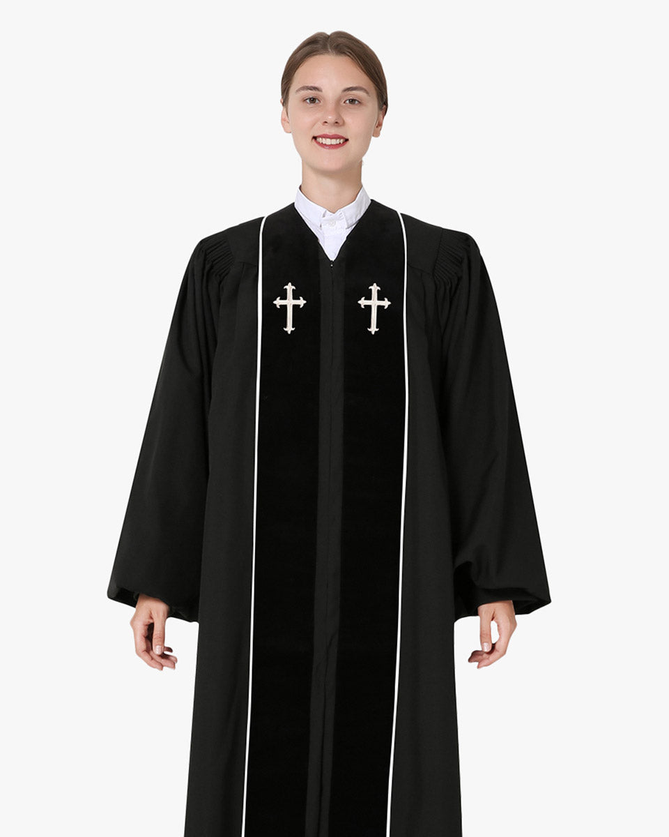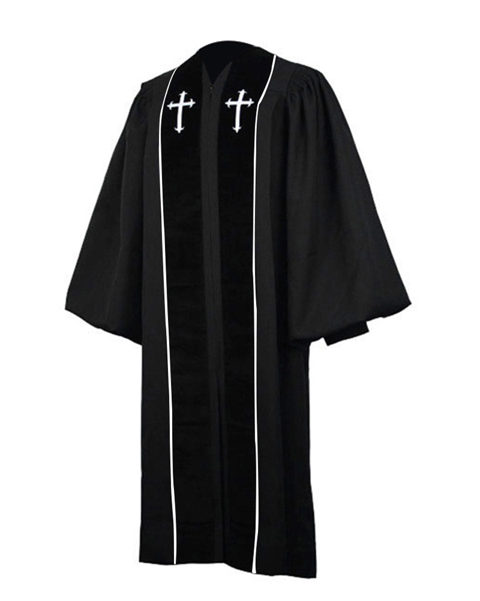 With our customizable John Wesley Clergy Robes, your clergy men / women are guaranteed to be considered as the important people of every church service worthy of respect and honor. Our John Wesley Clergy Robes are guaranteed to last for years, promoting a sense of newness and new sense of energy in every service. Each robe combines elegancy with antiquity by sporting two beautifully-embroidered white crosses on the front, an elegant black velvet panel with white piping that goes around the front and the shoulders, the cuffed sleeves, an intriguing darted & reinforced shoulder yoke, and an easy-to-use front zipper enclosure. The robe is made of an elegant 100% matte polyester fabric which is machine-washable and easy to care for as well.