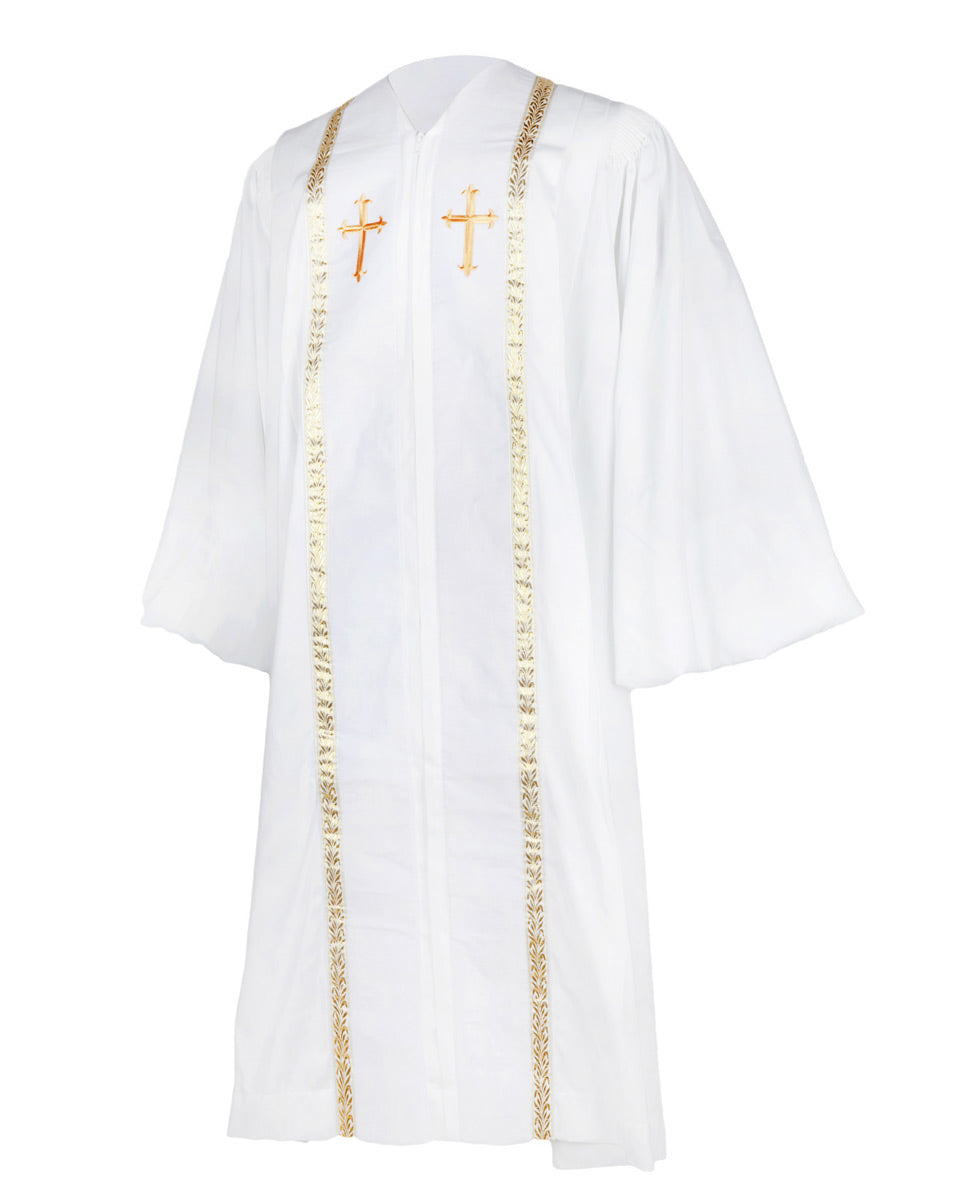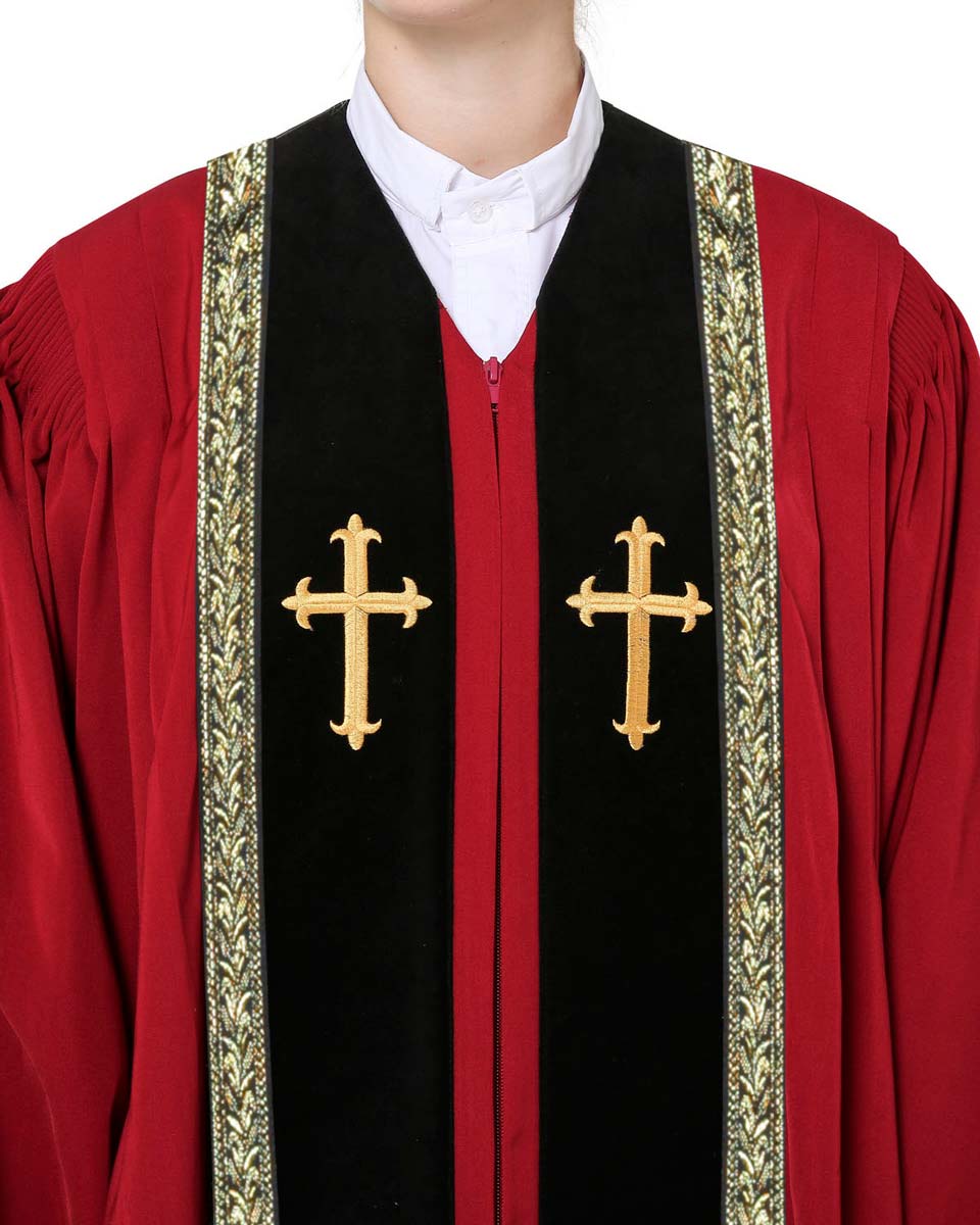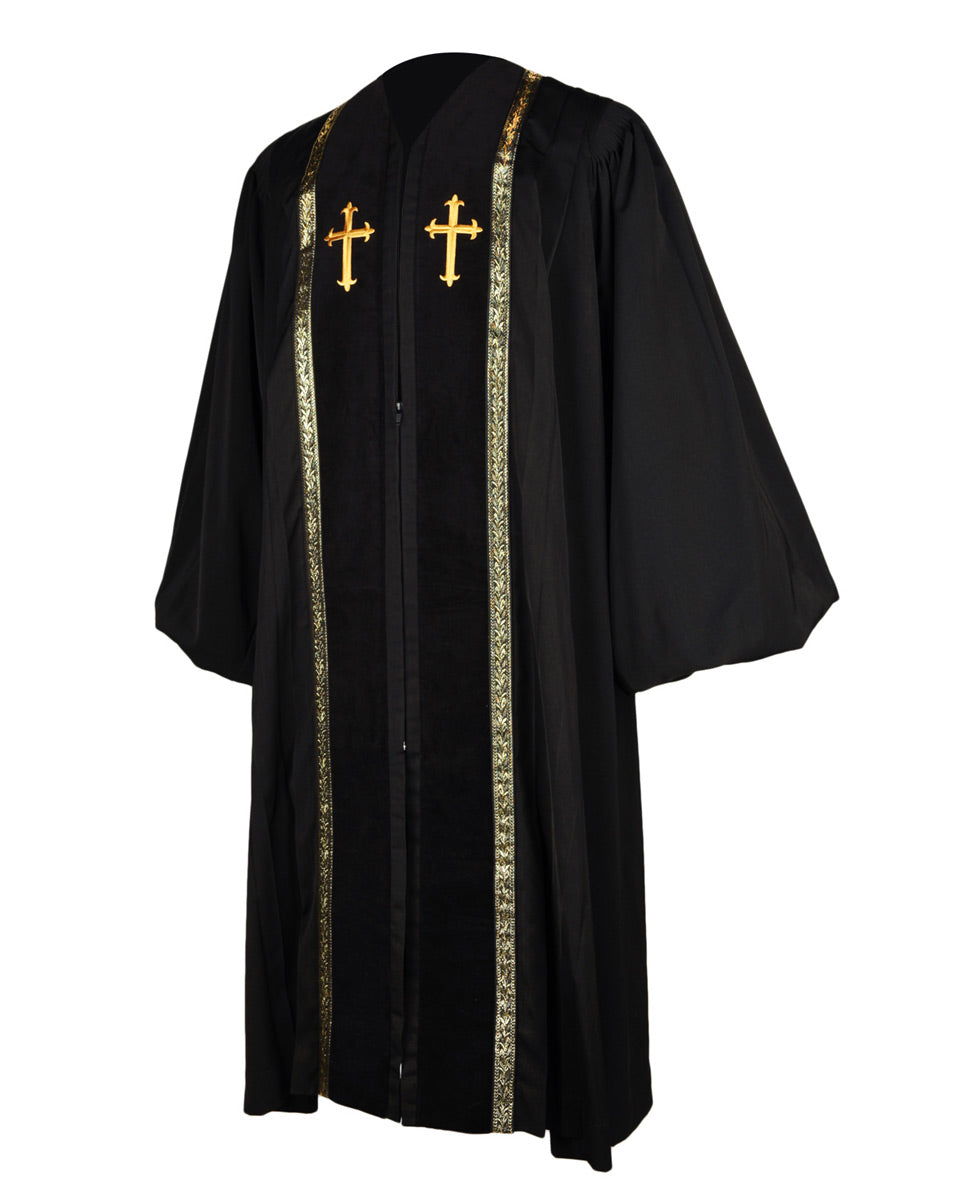 Our RT Welsley Clergy Robe is made of superior matte polyester, which is one of the most popular products on our website. It features cuff sleeves and black velvet panels with gold embroidery crosses on front. Furthermore, the ear of wheat alike decorative bars are stitched surround the velvet panels. The reinforced fluting across the shoulders and back can strengthen the construction of the robe. There are 6 sizes for all figures and 4 color combinations for you to choose.