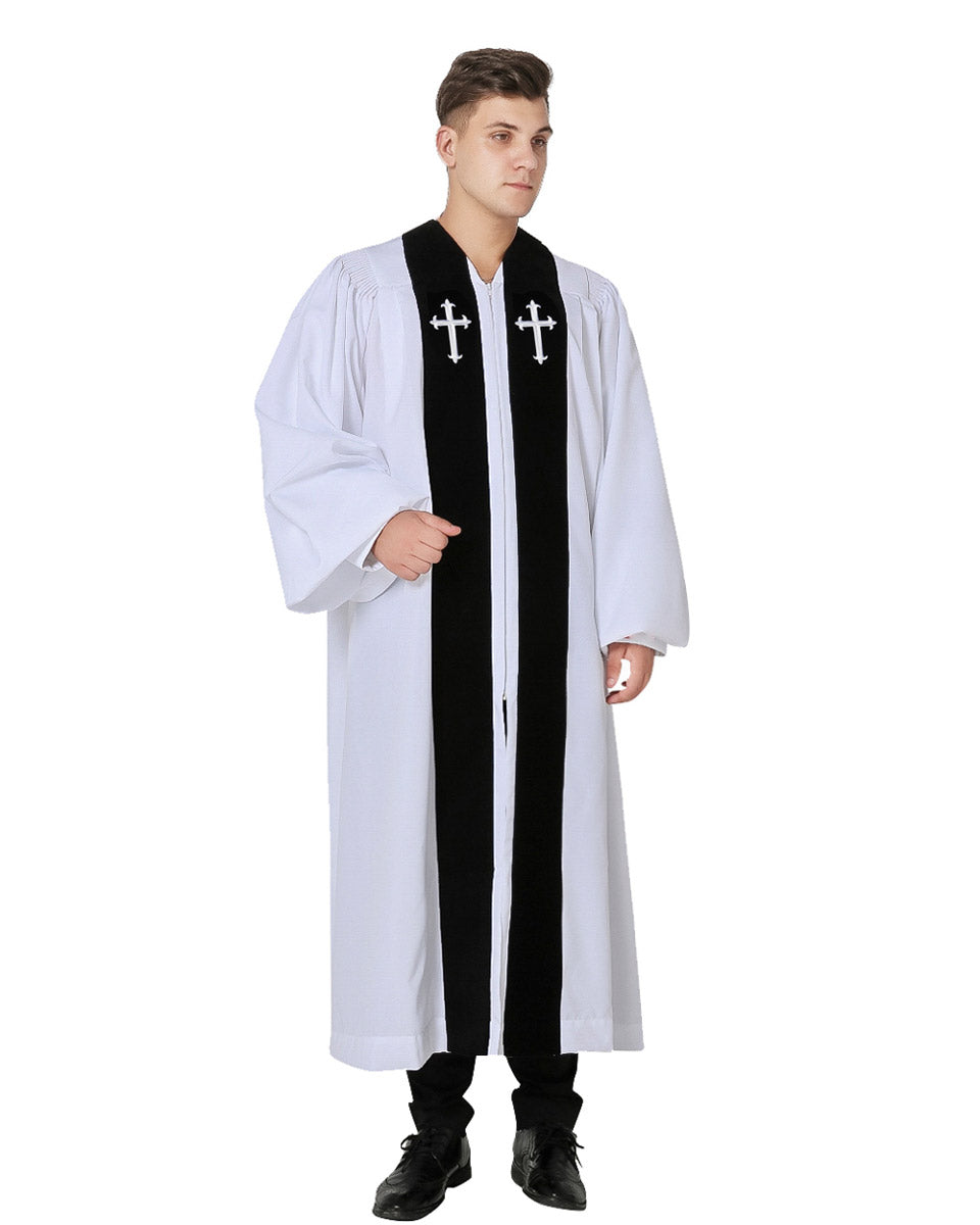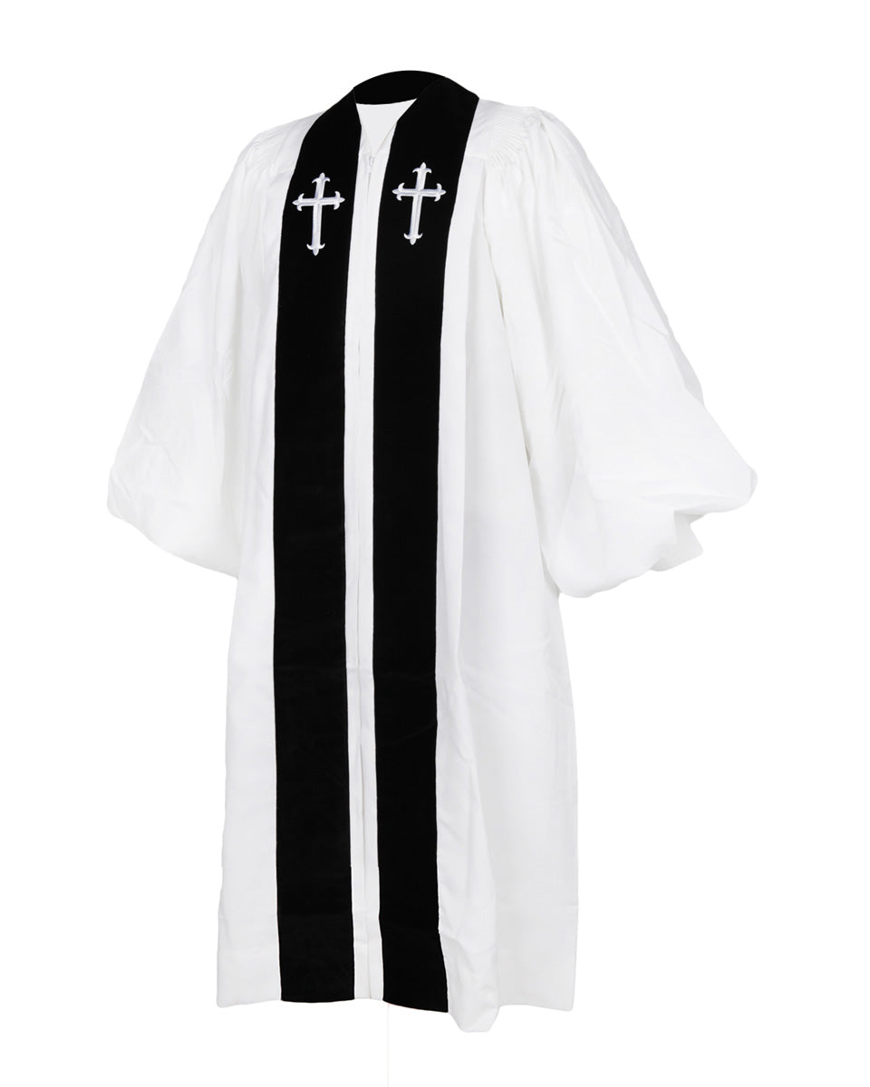 This is indeed one of our most popular products on our website; with our customizable Velvet Geneva Clergy Robes, your clergy men and women are guaranteed to be considered as important people who will receive the required respect needed from every church service attender. Apart from this, our Velvet Geneva Clergy Robes are guaranteed to last for years, promoting a sense of newness and new sense of energy in every service. Each robe combines elegancy with antiquity by sporting two beautifully-embroidered white crosses on the front, an elegant black velvet that goes around the front, and the shoulders, an intriguing darted & reinforced shoulder yoke, and an easy-to-use front zipper enclosure. The robe is made of an elegant 100% matte polyester fabric which is machine-washable and easy to care for as well.