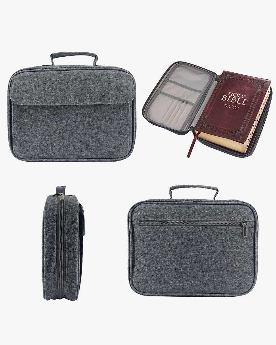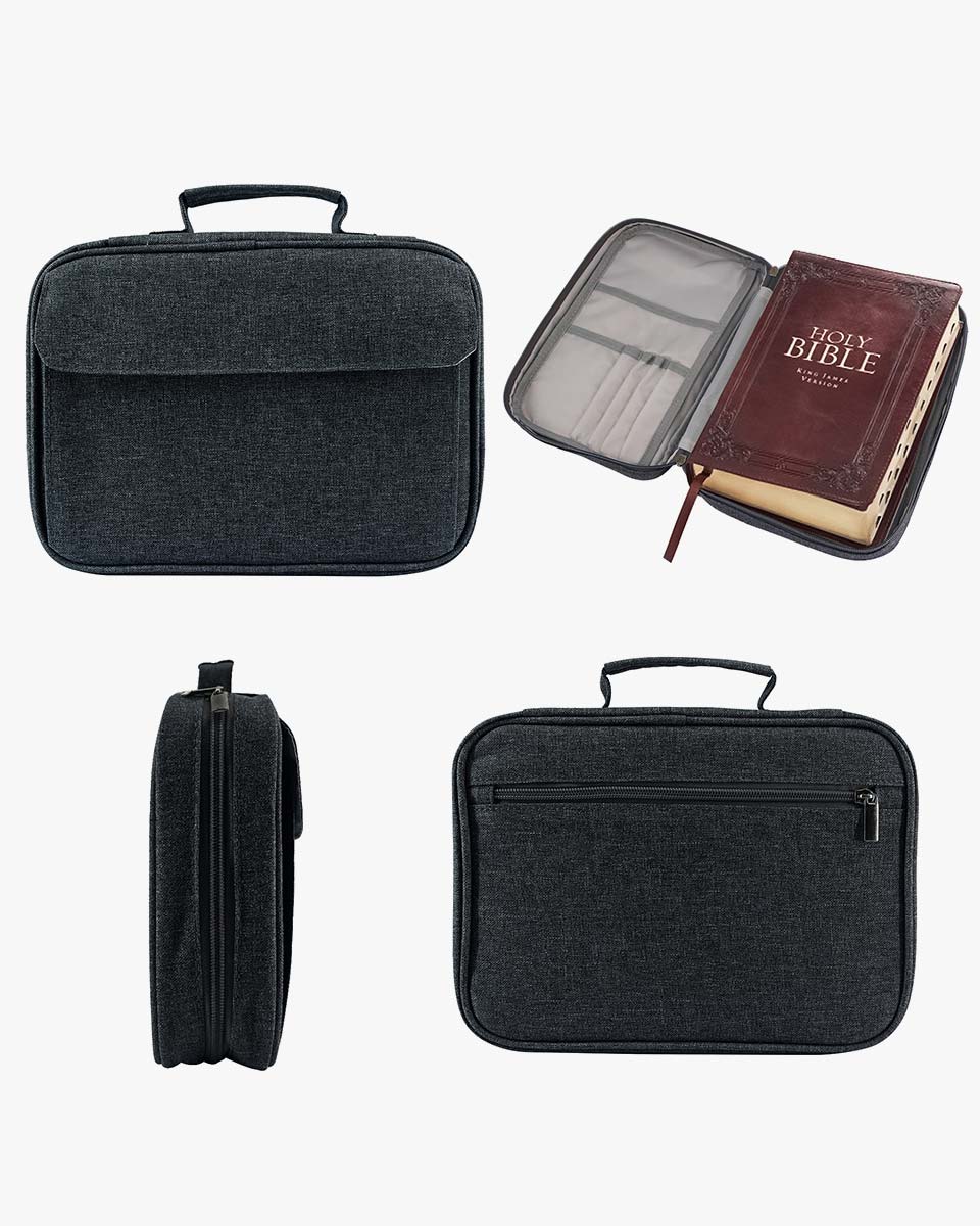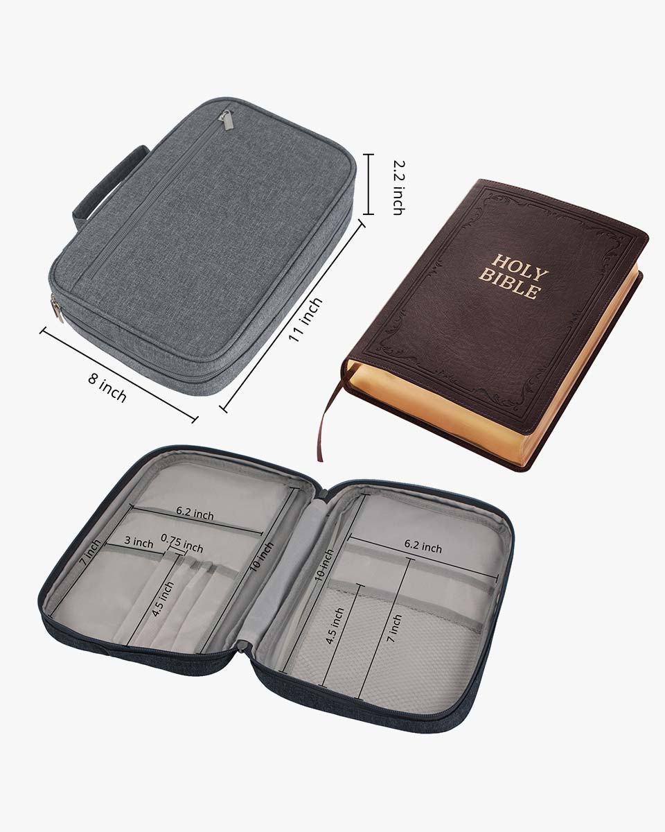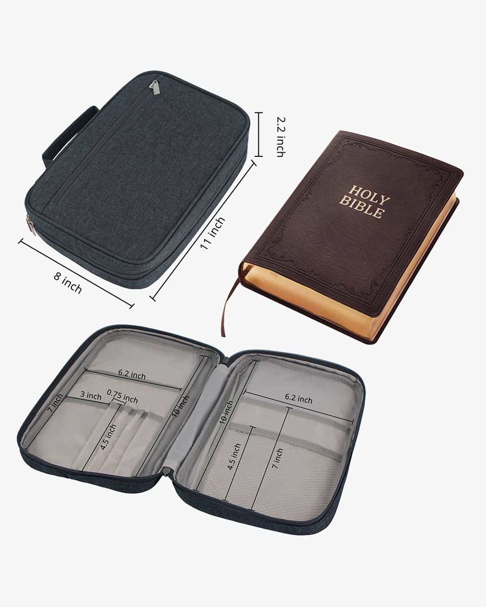 It’s well made of water-resistant 600D polyester which is wear-resistant and you could use it for many years. With two silver zippers, make it more convenient to open and close. With back and front pockets, it is perfect for storing notebooks, passports, tickets and cards, keys, and files. Cover fits books and bibles no larger than: 11 x 8 x 2.2 inches. Please measure your bible size before purchasing to avoid return. Allow extra room to avoid a too snug fit. Our zippered style Bible case keeps your Bible clean and safe from accidents and mishaps. Interior slip pockets can hold the Bible cover in place and the pen loop provides a handy place for a pen or highlighter whenever you need it. With a sturdy carrying handle on the bible cover, it is easy to carry or hold every time you need it, whether you are on the way to a church service, worship, Bible study, or on a bus.
