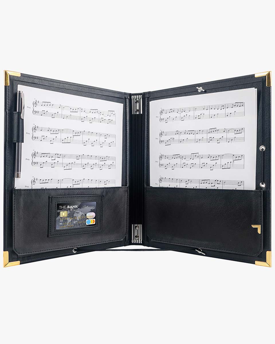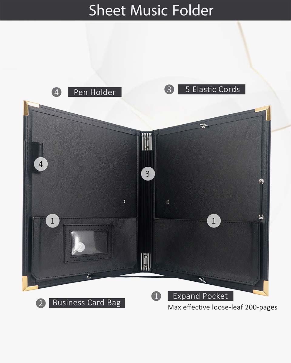 This professional binder has High-quality black PU leather makes it waterproof, solid, and durable and accented with hand-stitched edges allowing for the organization of the music/ piano folder. The black music folder boasts two expanded horizontal internal pockets, providing ample space to store all your sheet music. 10″ W x 12.5″ H x 1.2″ D, weight approx: 22.4 oz/ 1.4 lbs. Organize your sheet music with this black music folder featuring elastic stays for secure closure. 110° open for one-handed holding, 180° open for placement on a music stand/piano. The sleek black design exudes professionalism and elegance, making it the perfect choice for musicians of all genres. Features classic metal corners for protection and durability.