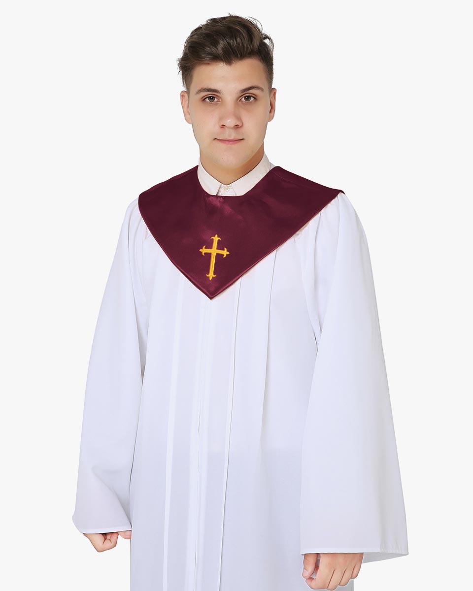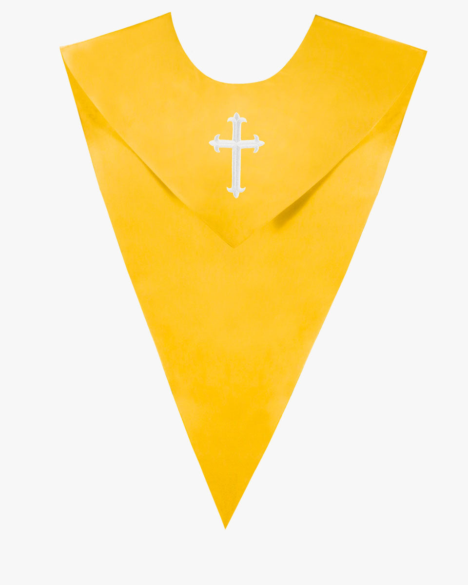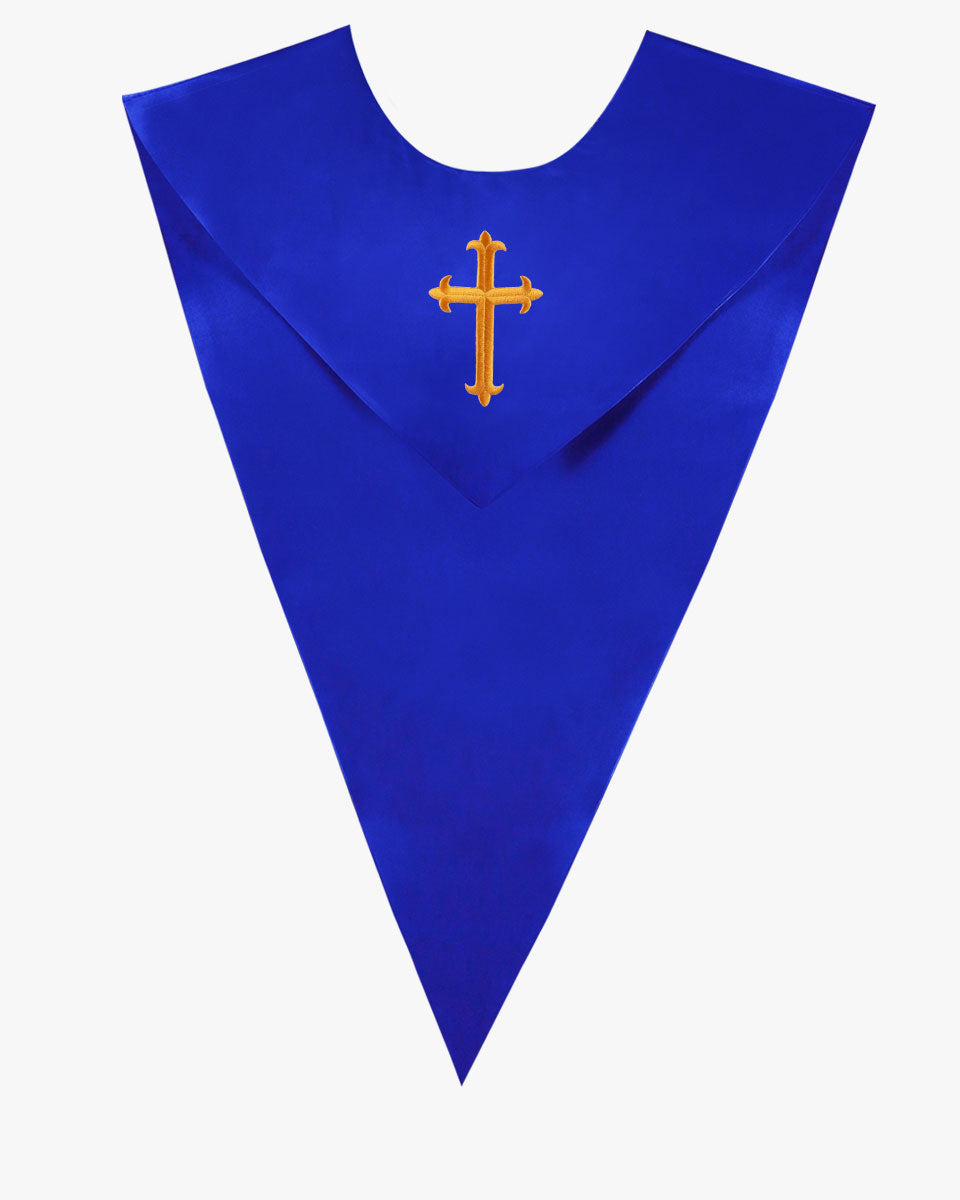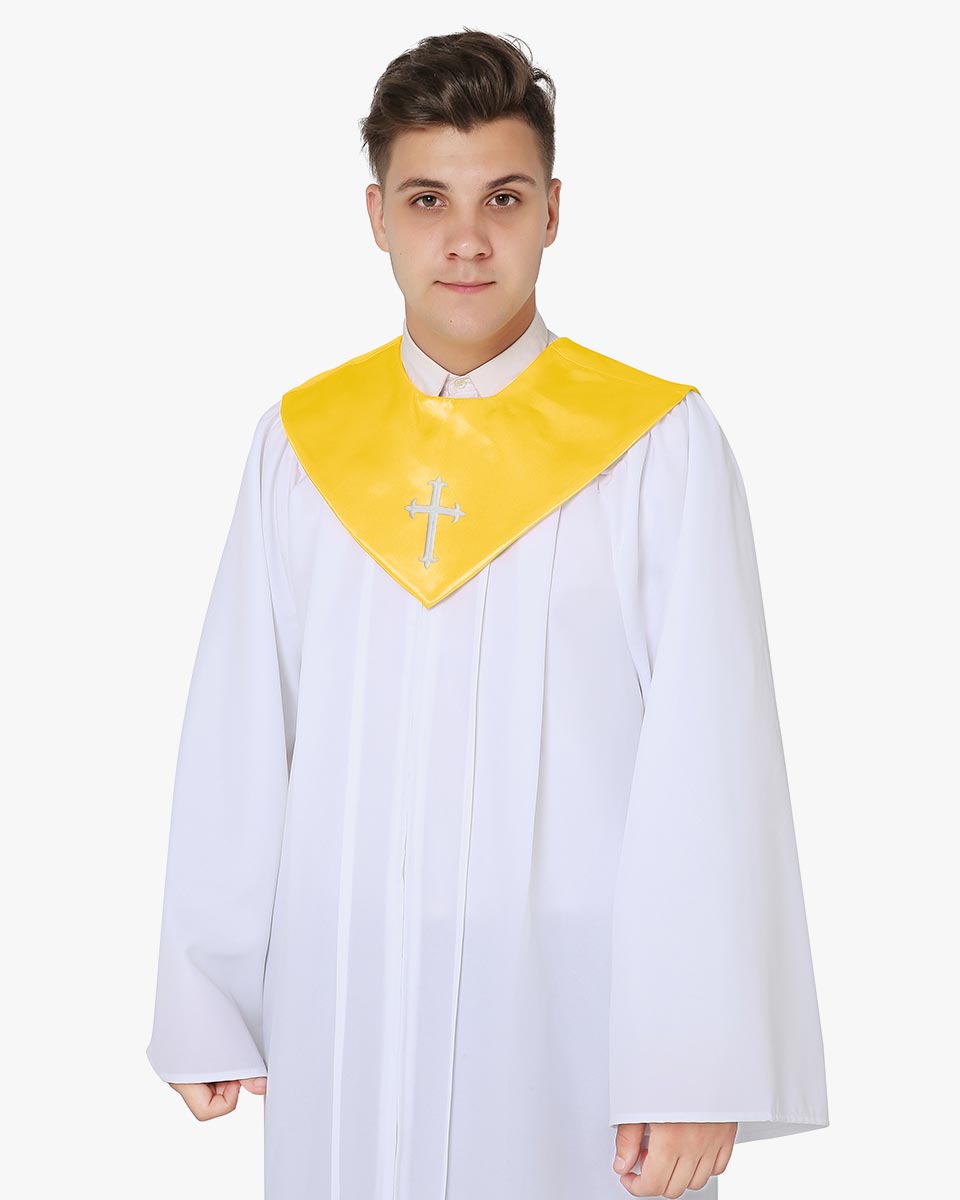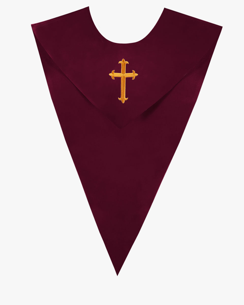 The One Color V-neck Stole with Cross is becoming increasingly popular for choirs and events. It is made of top-end, lightweight shiny satin fabric which makes the stole glossy and contour to the shape of your body better. The pure color let the choristers be more elegant compare to the other stoles. The 3.9" long cross with contrasting colors in front is the highlight of the stole. Our stole is reusable because the premium fabric is durable and easy to clean. 5 colors are avalible to match your colorful choir robes.