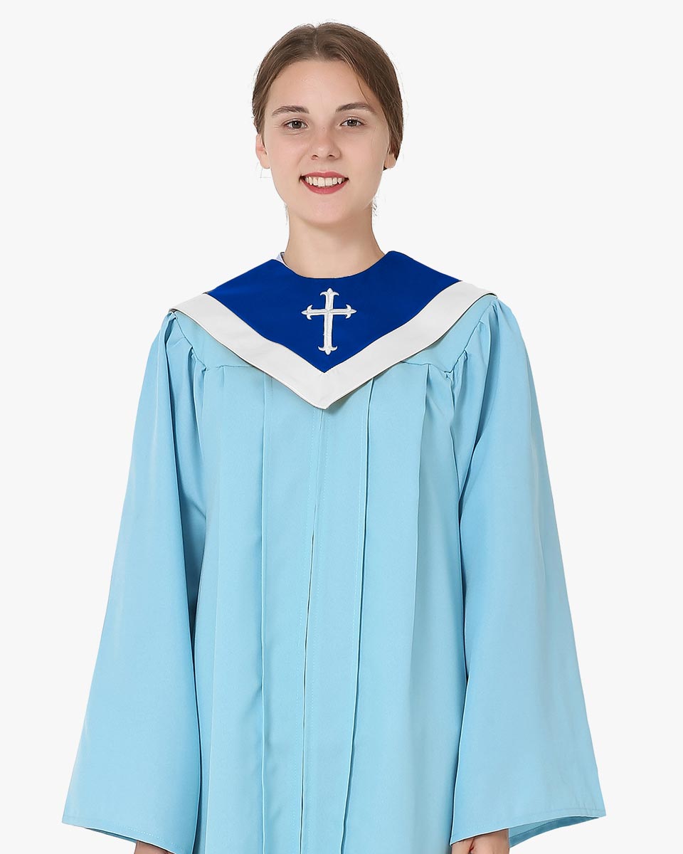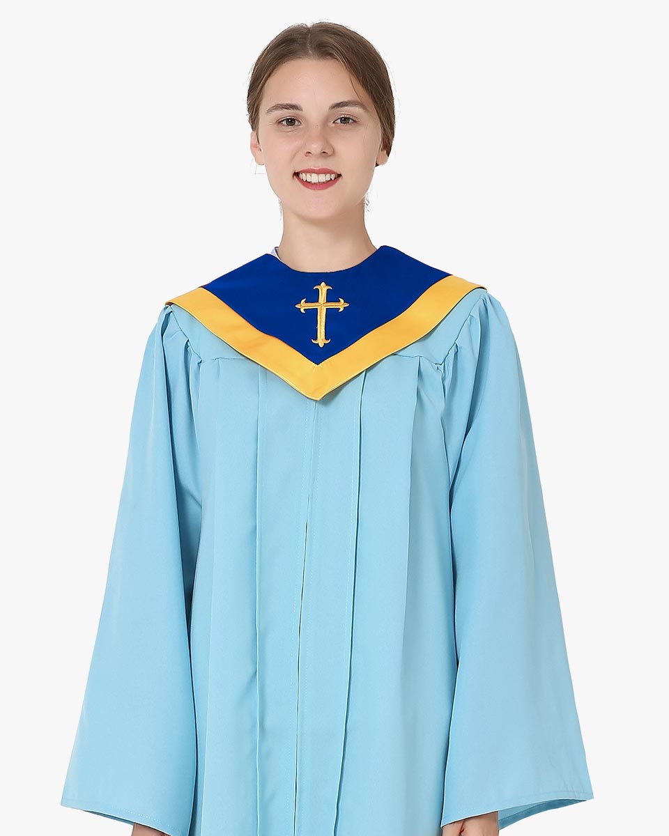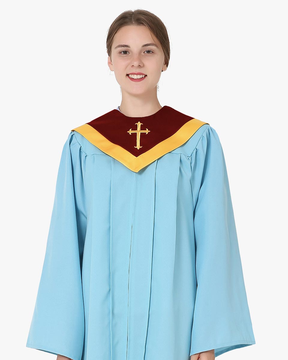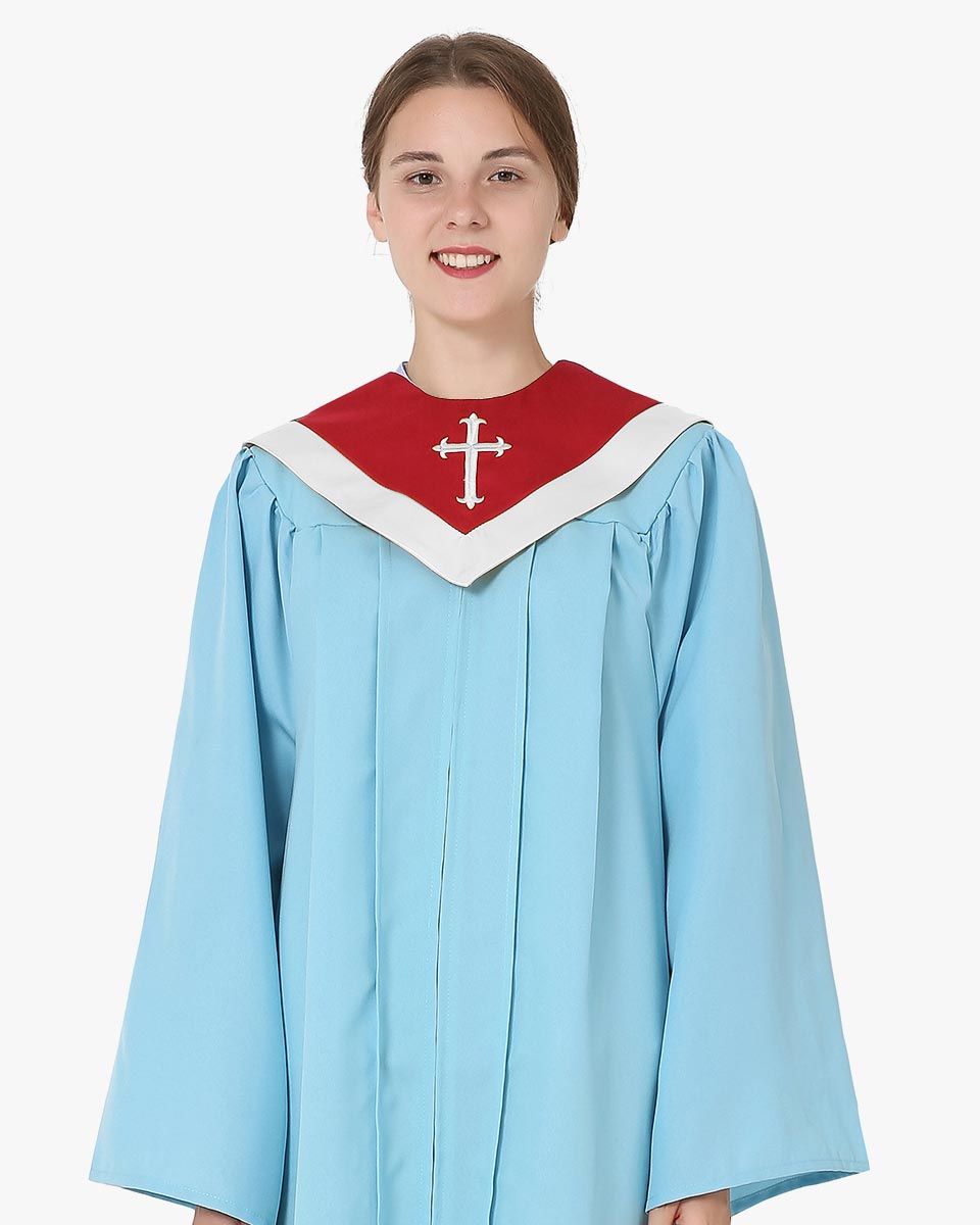 Our Reversible Choir Stoles with a Border and a Cross are some of our most elegant stoles that we have available on our website, allowing all choirs to absolutely shine in their choir performances, leaving a wonderful impression for all and also helping to include the spirit in every moment. There are 6 vibrant color combinations available, allowing choir members to match the stoles with their choir robes; likewise, the front side of the stole is made of a lightweight, plain, and strong-woven fabric with a matte finish, and the reverse side and the front trim is made of a bright and shiny satin. The marvelously embroidered cross that is in the middle of the stole is 3.9" long. The popular stole decorated with the divine cross is our website’s best seller.