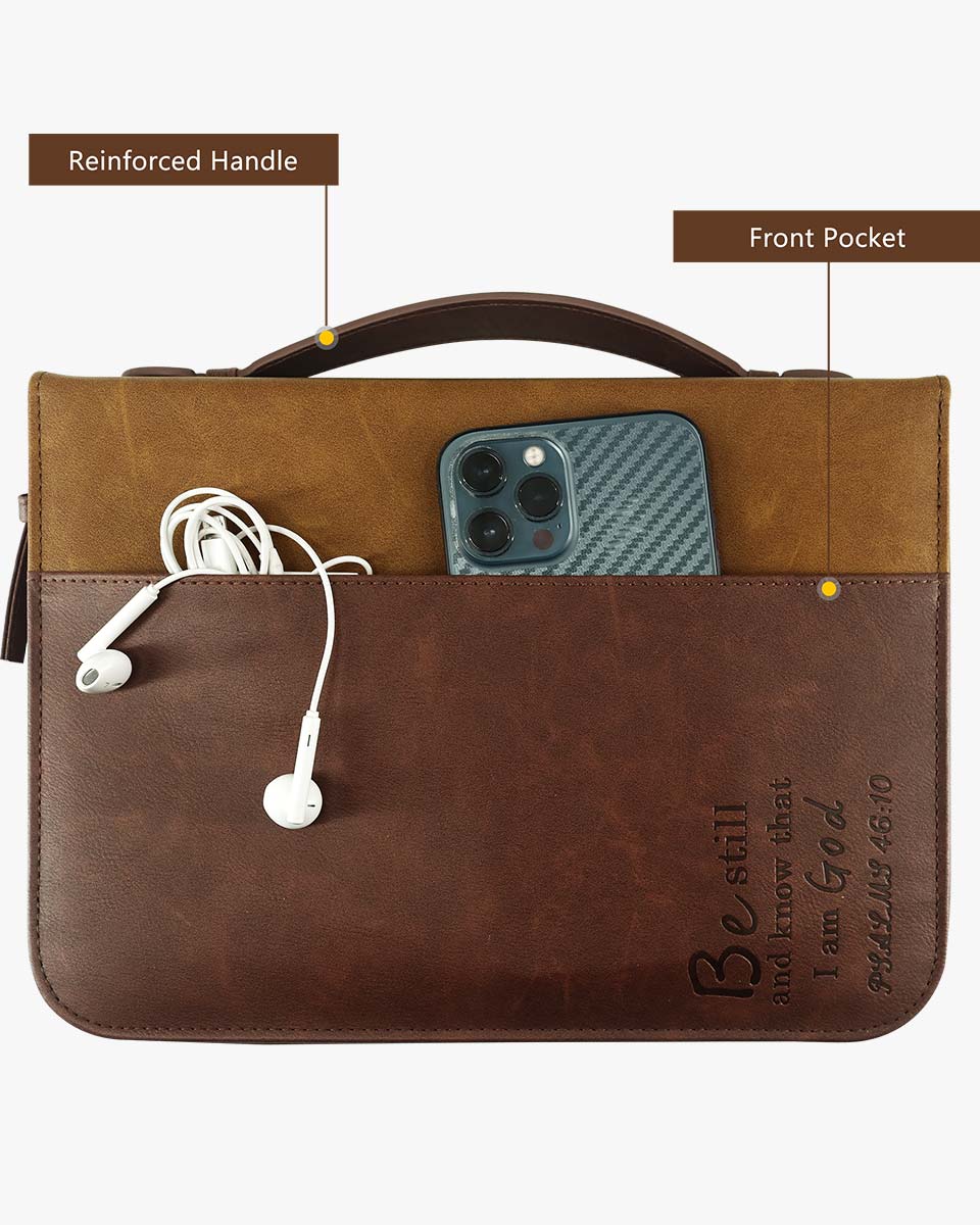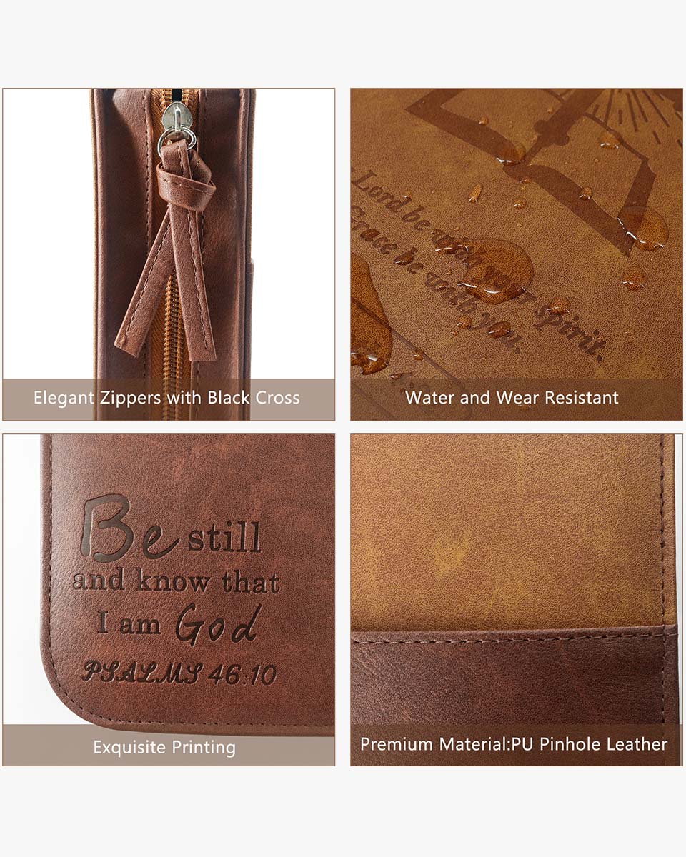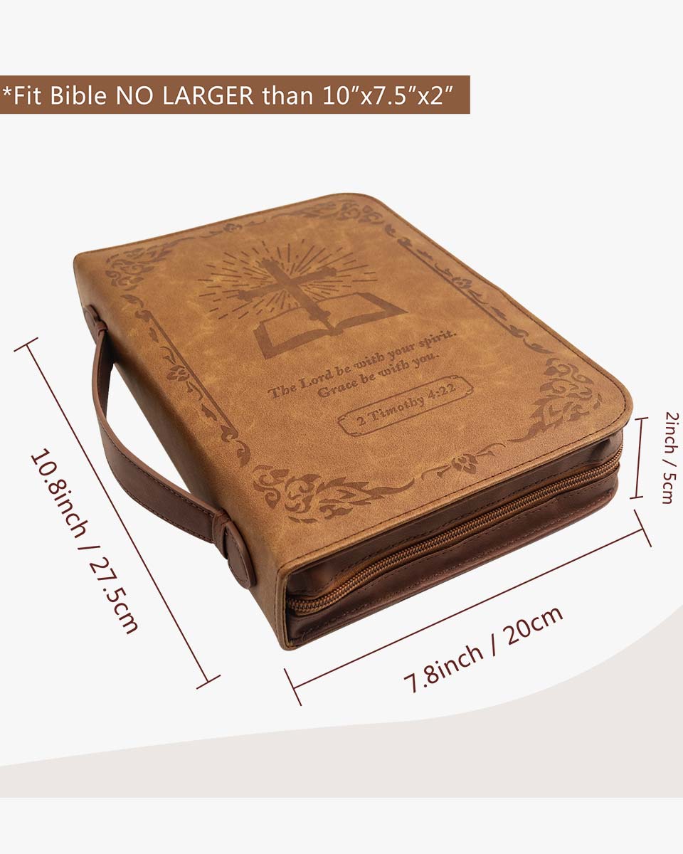 Zippered Bible case keeps your Bible clean and safe from accidents and mishaps. Interior slip pockets hold the Bible cover in place and pen loops provide a handy place for a pen or highlighter. The brown classic cover is debossed with a cross book graphic. The Bible case for men has the Bible verse from 2 Timothy 4:22 "The Lord be with your spirit. Grace be with you." And on the back, it verses from Psalms 46:10 "Be still and know that I am God". It has a back pocket and inner organizing pockets, perfect for storing notebook, passport, tickets and cards, keys, files, and a pen loop to hold your pen. Cover fits books and bibles no larger than 10 x 7.5 x 2 inches. please measure your bible size before purchase to avoid return. Allow extra room to avoid a too snug fit.