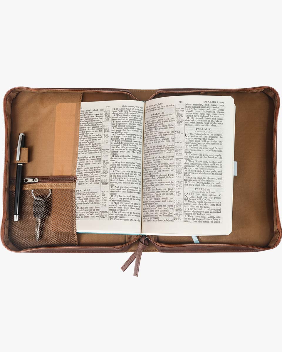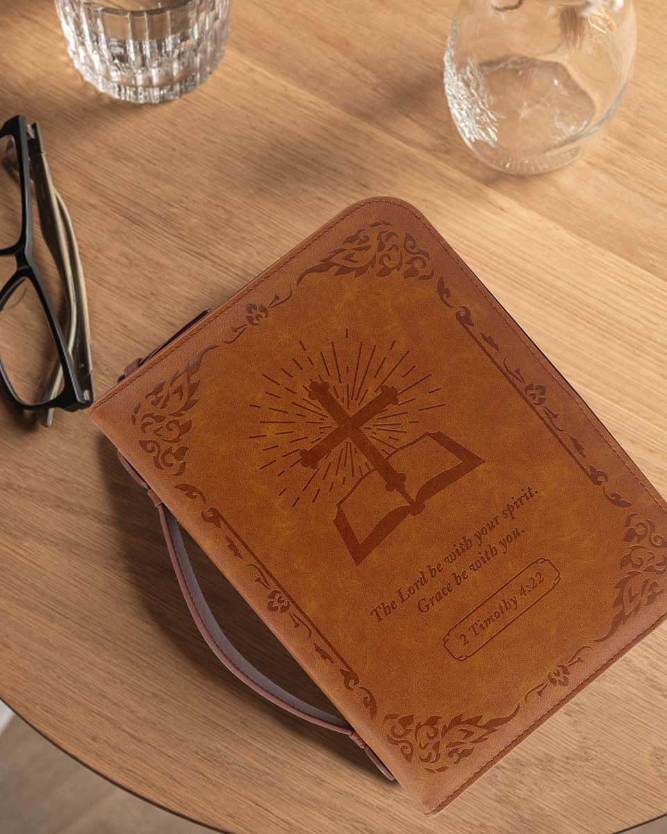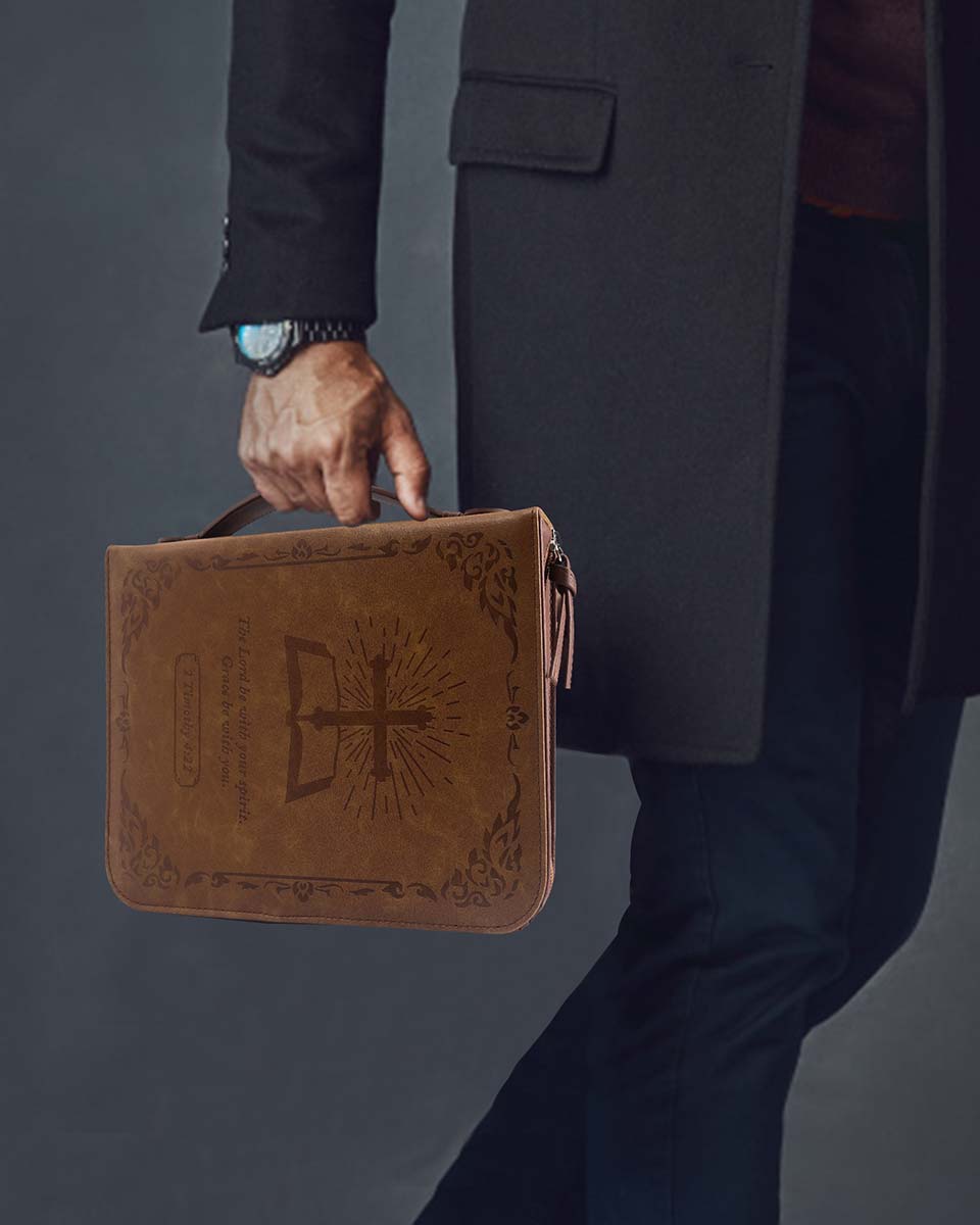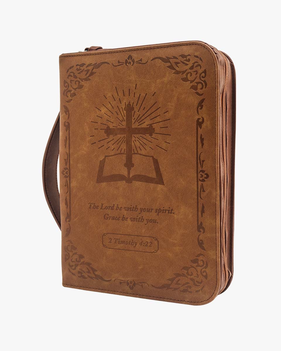Zippered Bible case keeps your Bible clean and safe from accidents and mishaps. Interior slip pockets hold the Bible cover in place and pen loops provide a handy place for a pen or highlighter. The brown classic cover is debossed with a cross book graphic. The Bible case for men has the Bible verse from 2 Timothy 4:22 "The Lord be with your spirit. Grace be with you." And on the back, it verses from Psalms 46:10 "Be still and know that I am God". It has a back pocket and inner organizing pockets, perfect for storing notebook, passport, tickets and cards, keys, files, and a pen loop to hold your pen. Cover fits books and bibles no larger than 10 x 7.5 x 2 inches. please measure your bible size before purchase to avoid return. Allow extra room to avoid a too snug fit.